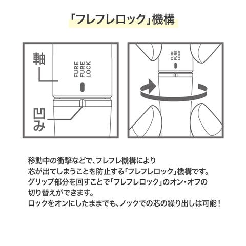 移動中の衝撃などで、フレフレ機構により芯が出てしまうことを防止する「フレフレロック」機構です。