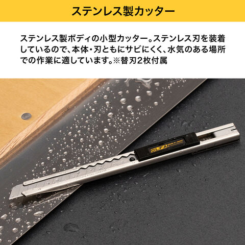 ステンレス製ボディの小型カッターです。ステンレス刃を装着。本体・刃ともにサビにくいため、水気のある場所での作業に適しています。※替刃が2枚付属しています。●薄物のカットに