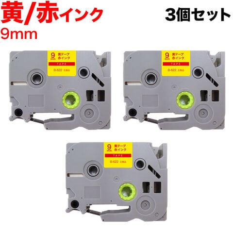 ブラザー用 ピータッチ 互換 テープ TZE-622 ラベルカートリッジ ピータッチキューブ対応 3個セット 9mm/黄テープ/赤文字