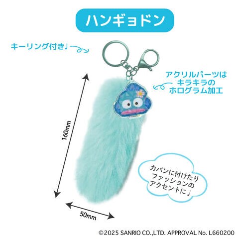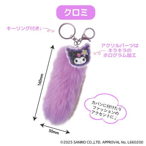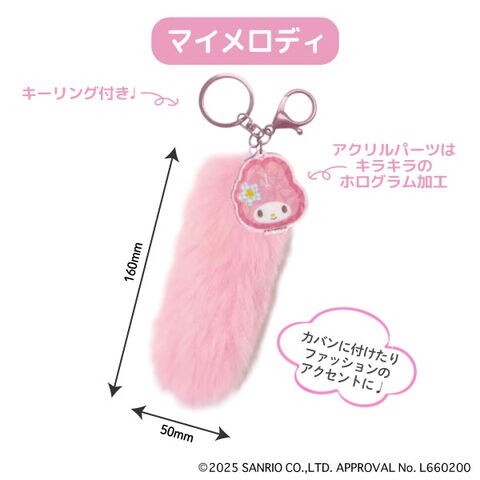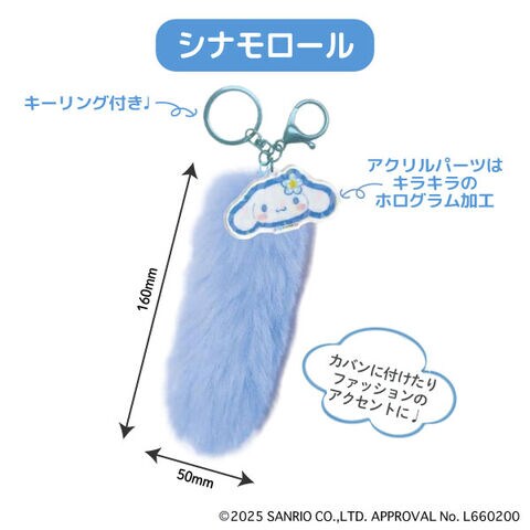 ふわふわのしっぽ型ファーが付いたサンリオキャラクターのキーホルダー。