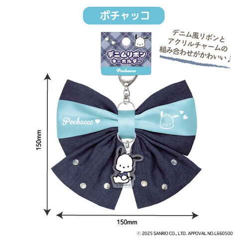 【メール便可】デニム生地がおしゃれな、サンリオキャラクターのチャーム付きリボンキーホルダー☆