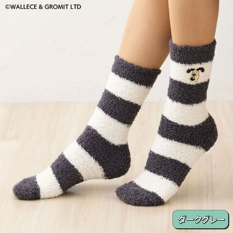 ウォレスとグルミット ワンポイント刺繍 ボーダー ルームソックス 23-25cm マシュマロ もこもこ 靴下 助野 ふわふわ ダークグレー