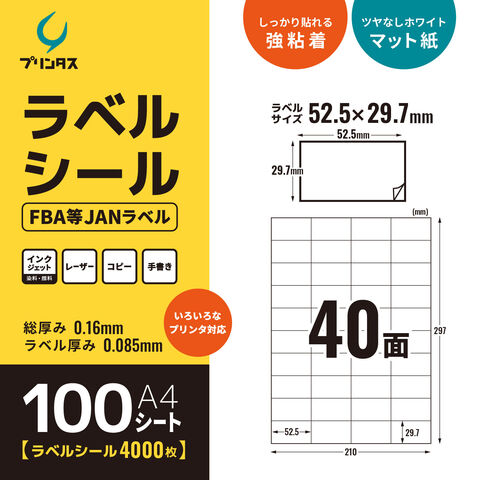 プリンタス ラベルシール A4 40面 FBA用JANラベルなど ホワイト ツヤなし マット しっかり貼れる強粘着 1000シート