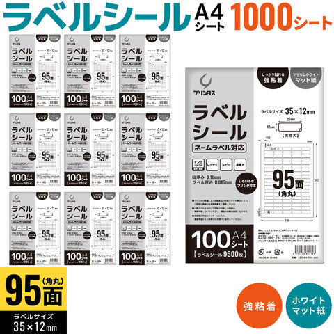 プリンタス ラベルシール A4 角丸 95面 ネームラベル対応 ホワイト ツヤなし マット しっかり貼れる強粘着 1000シート