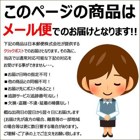 ■クリックポスト(日本郵便) クリックポストとは小型の商品などを安く簡単に送ることができ、受取人さまのご自宅等の郵便受箱に投かんするサービスです。 下記事項を十分ご確認の上でご注文をお願い致します。 ※お届け日時の指定はお受けできません。 ※概ね出荷日の翌日から翌々日にお届けします(お届け先が遠方の場合、離島等の一部地域の場合等は更に数日要する場合があります) ※お届け先の郵便受箱へ配達します。郵便受箱に入らない場合は、不在配達通知書を差し入れた上で、配達を行う郵便局へ持ち戻ります(ご自宅にポストが設置されていないとご利用できません) ※万一配送途中に事故(欠損・盗難・不達・延着)があった場合でも、内容品の損害賠償は行いません。 ※日曜日・祝日の配達も行なっております。 ※当店では追跡サービス(追跡番号)はご利用できません! |