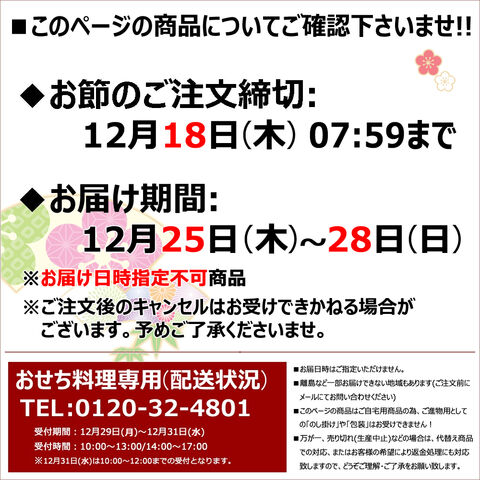 商品内容 ■田作り20g、丹波黒黒豆60g、ふきのうま煮50g、里芋含め煮4個、たたきごぼう70g、鱈のうま煮60g、にしん一口巻昆布6本、松茸しぐれ40g、金柑甘露煮70g、栗の甘露煮4個、味付しいたけ5枚、穂先竹の子3切、なます50g、酢れんこん70g、真たらこ角煮70g、ぶりの照焼2切、焼ほたて3個、だし巻150g、手綱こんにゃく4切、高野豆腐含め煮6切、祝海老3尾、あさりのうま煮60g、若桃甘露煮5個、紅白豆マリネ65g、白福豆75g、紫福豆 (珈琲味) 75g、かきと里芋のクリーム煮85g、ぜいたく煮50g、とりつくね48g、鶏の照焼100g
