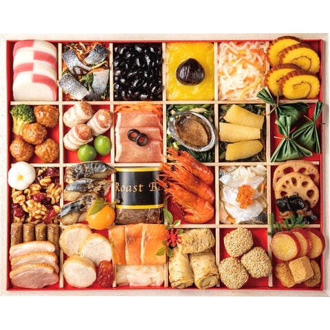 ■一の重 40品:紅白彩り蒲鉾、にしん菜の花和え、黒豆、きんとん、渋皮栗甘露煮、柚子なます、伊達巻、味付き肉団子、ブロッコリーバジル香味、ベーコンチーズドック、若桃甘露煮、キャロットラぺ、生ハム、ブラックオリーブ、小松菜と油揚げ煮、あわび煮、菜の花の松前漬け風、味付数の子、牛肉笹包み、クランベリーくるみ、白花餅、さわら西京焼き、金柑、ローストビーフ、海老旨煮、こはだかぶら、小鯛笹漬け、いくら醤油漬け、蓮根煮、昆布巻、たたきごぼう、合鴨スモーク、塩レモンチキン、ドライトマト赤ワイン煮、オニオンマリネ、スモークサーモン、焼き湯葉巻、ごまだんご、鳴門金時芋レモン煮、わらび餅きなこ ※約3~4人前 ※40品 ※重箱盛付済商品 ※白木製重箱入り ※お重サイズ:約32.9cm×41.2cm×5.0cm(一段 7.0cm) ※諸事情により献立の内容が変更、または製造が中止になる場合もあります。 ※万が一、売り切れ(生産中止)などの場合は、代替え商品での対応、またはお客様の希望により返金処理にも対応致しますので、どうぞご理解・ご了承をお願い致します。 |
