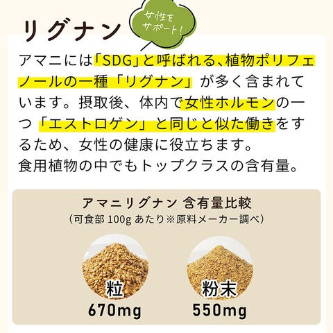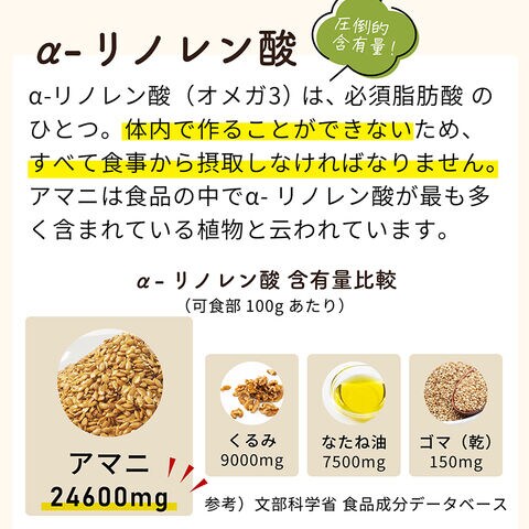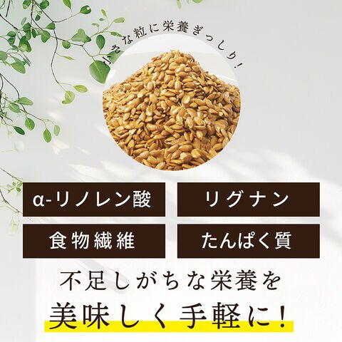 エネルギー 566kcal、たんぱく質 20.7g、脂質 45.3g、炭水化物30.3g(糖質7.3g、食物繊維 23.0g)、食塩相当量 0.2g、α-リノレン酸 25.9g、 アマニリグナン 670mg
