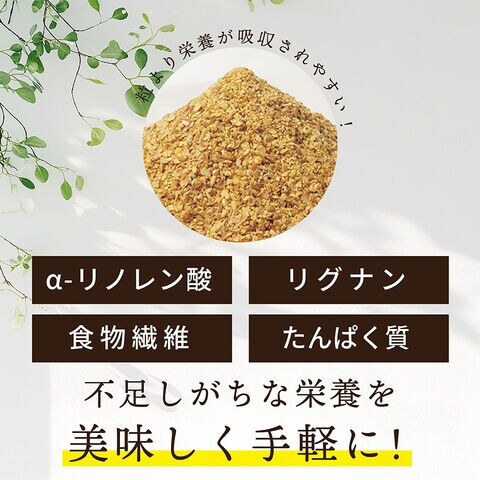 エネルギー 558kcal、たんぱく 20.4g、脂質 43.9g、炭水化物 31.6g(糖質 9.2g、食物繊維 22.4g)、食塩相当量 0.2g、α-リノレン酸 24.6g、 アマニリグナン 550mg