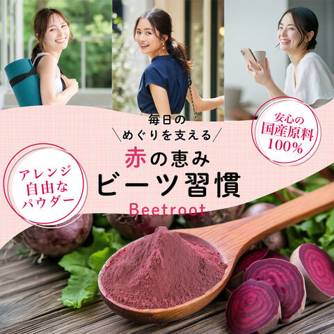 北海道産赤ビーツ100%使用のビーツパウダー50g。農薬不使用で育てた国産原料のみを使用し、デキストリンや甘味料を加えない無添加仕上げ。食物繊維・葉酸・鉄・亜鉛に加え、ポリフェノール「ベタレイン」や硝酸イオン(NO)を含む注目のスーパーフードです。ほんのり自然な甘みでスムージーやドリンク、ポタージュなど料理にも使いやすく、毎日のめぐりときれい習慣をやさしくサポート。家族で続けやすいナチュラルなビーツ習慣に。