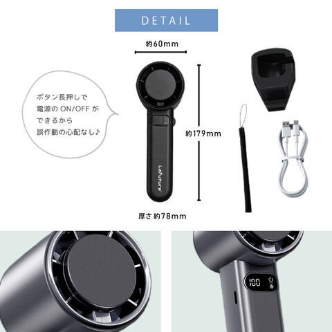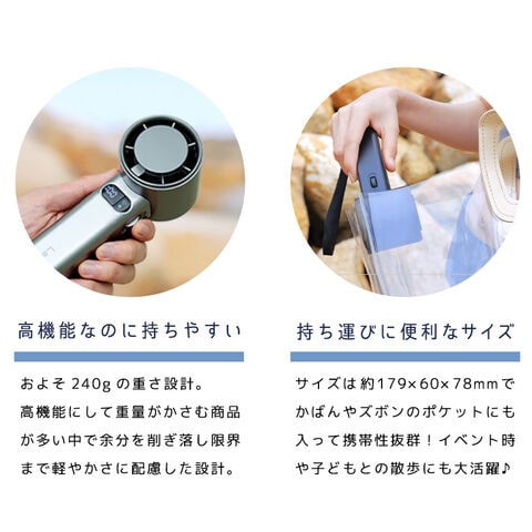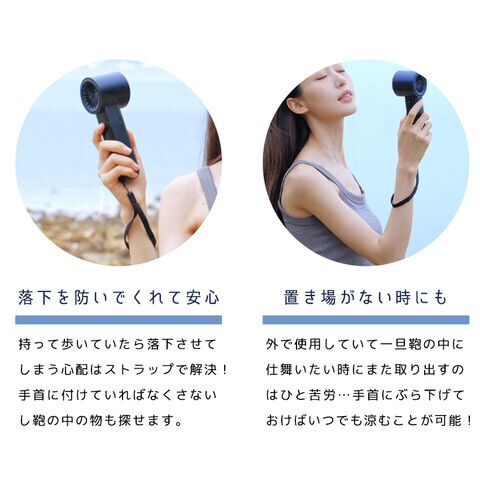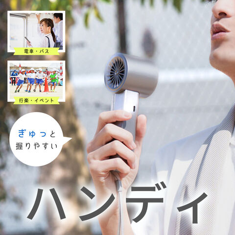 | 【ハイパワー送風】 3段階風速タイプよりパワーが強く、ドライヤー並みの風力を実現しました。 通常のハンディファンでは物足りないときや、キャンプなどの暑さを感じやすい野外活動にもぴったりです。 |