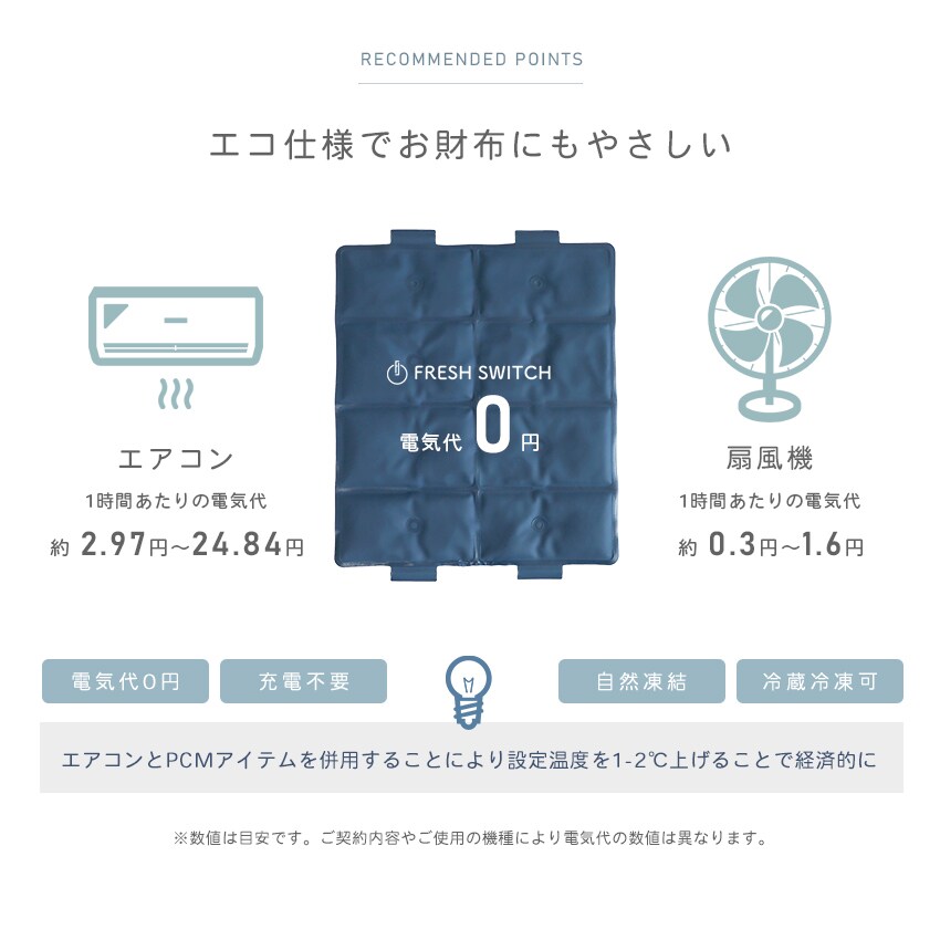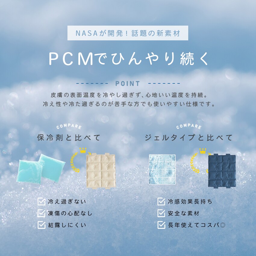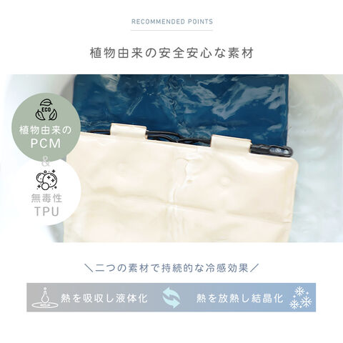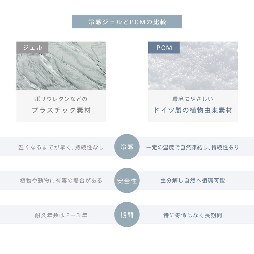 | 【PCMとは?そんな素材?安全性は?】 米国NASAが開発した植物由来の新素材です。 温度環境に応じて繰返し熱を放出、吸収できる相変化物質です。 植物から抽出していますので、人と環境にやさしい素材です。 |