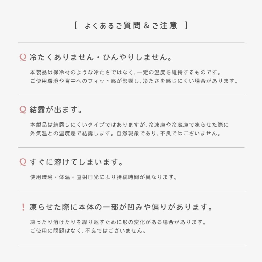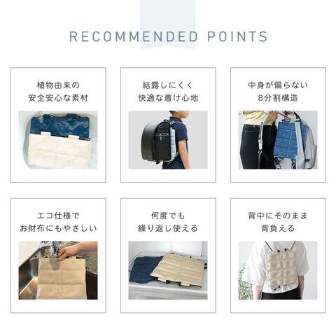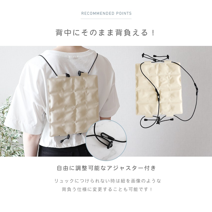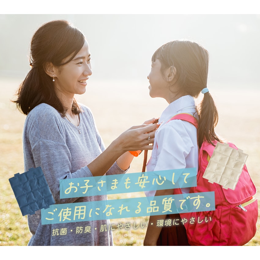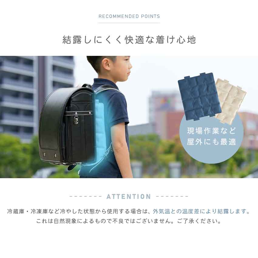 | お子さまから大人まで、あらゆるリュックに対応! 新素材のPCMを使用し28℃以下で自然凍結。 |