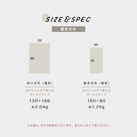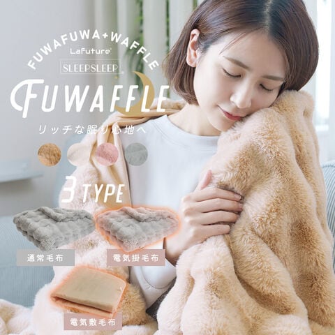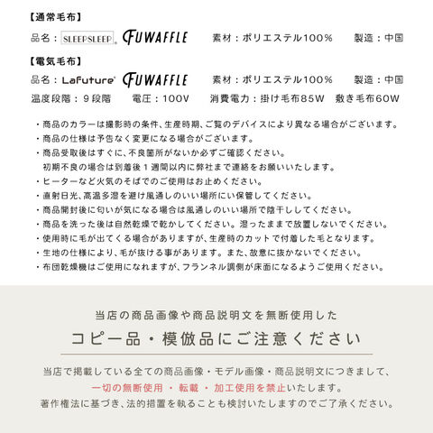 | 製品名:SLEEPSLEEP FUWAFFLE 品番:lff-moko 材質:ポリエステル 色:ミルキーホワイト・ラテキャメル・モーヴピンク・ムーングレー 商品内容:本体、説明書、コントローラー(電気毛布の場合) 通常毛布: サイズ:ハーフ:100cm × 160cm シングル:140cm × 200cm セミダブル:160cm × 200cm ダブル:180cm × 200cm 重量:ハーフ:約1.12kg シングル:約1.93kg セミダブル:約2.19kg ダブル:約2.46kg 電気毛布: サイズ:電気掛け毛布:130cm × 188cm 電気敷き毛布:160cm × 80cm 重量:電気掛け毛布:約2kg 電気敷き毛布:約1.2kg 温度段階:9段階 電圧:100V 消費電力:掛け毛布85W・敷き毛布60W |