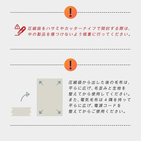 | ※商品のカラーは撮影時の条件、生産時期、ご覧のデバイスにより異なる場合がございます。 ※商品の仕様は予告なく変更になる場合がございます。 ※商品受取後はすぐに、不良箇所がないか必ずご確認ください。初期不良の場合は到着後1週間以内に弊社まで連絡をお願いいたします。 ※ヒーターなど火気のそばでのご使用はお止めください。 ※直射日光、高温多湿を避け風通しのいい場所にい保管してください。 ※商品開封後に匂いが気になる場合は風通しのいい場所で陰干ししてください。 ※使用時に毛が出てくる場合がありますが、生産時のカットで付着した毛となります。 ※生地の仕様により、毛が抜ける事があります。 また、故意に抜かないでください。 ※使用前に、製品に表示されている電源と電圧を確認してください。 ※電気毛布以外の用途では絶対に使用しないでください。 ※ドライクリーニングはしないでください。濡れている場合や湿気がある場合は使用しないでください。 ※30℃の水で優しく手洗いをしてください。 ※洗濯前、電気毛布からコントローラーを必ず取り外してください。 ※電気毛布は過度の洗濯に耐えられません。洗濯回数は5回超えないようにしてください。 ※洗濯後、電源を入れて毛布を乾燥させる行為は絶対にしないでください。 ※風通しの良い暗い場所に干してください。 ※使用前に、毛布が完全に乾いていることを必ず確認してください。 ※アイロンは使用しないでください。 ※熱に敏感な方、無意識、無行動能力な方、及び4歳未満の乳幼児は、この製品を使用しないでください。 ※また、4歳以上の子供が本製品を使用する場合、必ず保護者が操作し、及び監視下で使用してください。 ※病院での医療用途では使用しないでください。 ※4歳以上8歳未満の子供は、保護者の監視下で、常に最低温度に設定した場合に限り使用してください。 ※この製品は玩具ではありません。子供が製品で遊ばないようにしてください。 ※本製品のケーブル及び制御部は、適切に配置されていない場合、巻き込み、首つり、つまずき、または踏みつけの危険を引き起こす可能性があります。使用者は、余分なコードや電気コードを安全な方法で配置するよう注意を払ってご使用ください。 ※児童による製品の清掃やメンテナンスは行わないようにしてください。 ※電気毛布を鈍器で叩いたり、鋭利な物で刺したりしないでください。 ※製品を定期的に点検し、損傷の兆候がないか確認してください。損傷の兆候がある場合、使用を中止してください。 ※電源コード、コントローラー、またはコネクタが損傷している場合は、使用を中止してください。 ※電源コードやコントローラーを絞ったり、製品を引きずったりしないでください。コントローラーは使用中に覆わないでください。 ※製品の分解や改造は一切しないでください。使用方法など不明点がありましたら販売店へご連絡ください。 ※敷き毛布は絶対に折り曲げた状態で使用しないでください。 ※使用しない場合や部屋に誰もいない場合は、必ず電源を切ってください。長時間使用する場合はやけどを防ぐため、最も低い温度を設定し、使用してください。 ※動物と一緒に使用しないでください。 ※ケーブルを引っ張ったり、ねじったりしないでください。 ※この製品は家庭用としてのみ使用してください。 ※部品が欠落している、破損している、損傷している、またはひどく摩耗している場合は、使用を中止してください。 ※取扱説明に反した方法で使用しないでください。危険が生じる可能性があります。 ※コンセントからプラグを抜く前に電源スイッチをOFFにしてください。 |