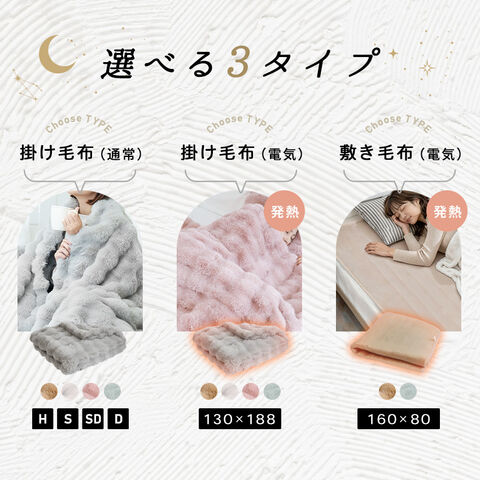 | 電気毛布: 大人気ふわもこ毛布に、ぽかぽか暖かい電気毛布が登場! 寒い日でも布団に入るのが楽しみに。 ●9段階のぽかぽか温熱で冷え込む夜もぐっすり ●好みで選べる掛けor敷き毛布 ●便利なタイマー設定(1~9H) ●9時間で安全自動OFF ●コントローラーを取り外して洗濯機で洗える |