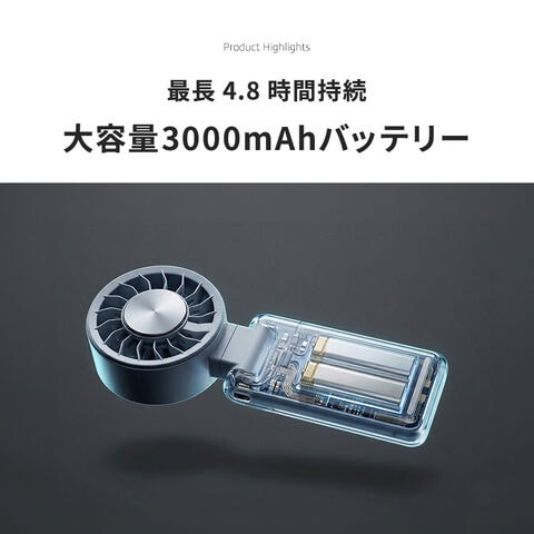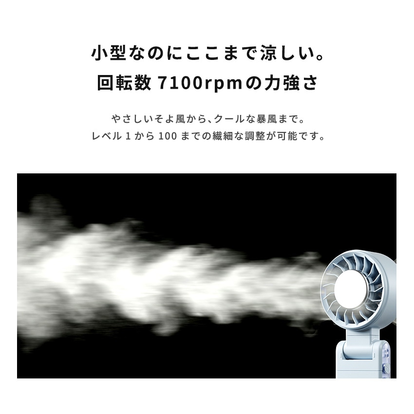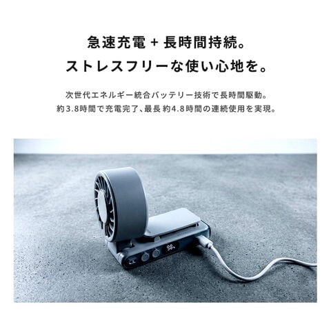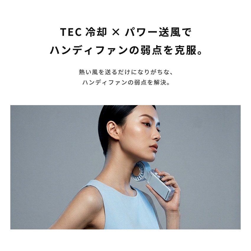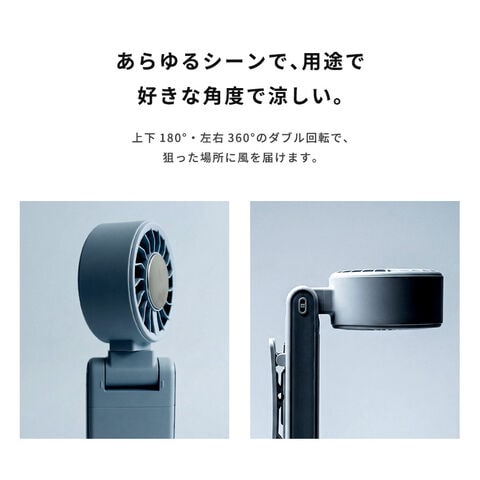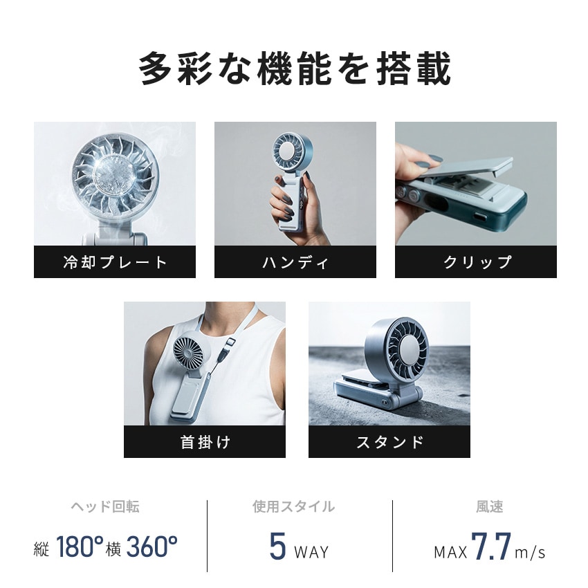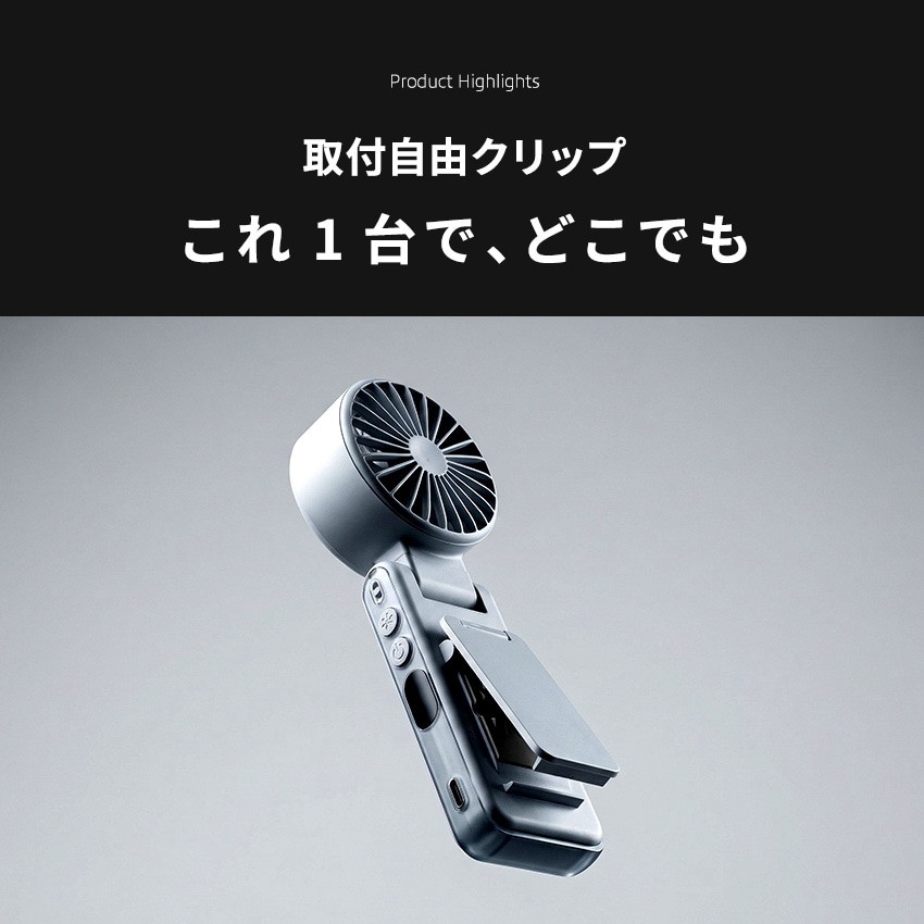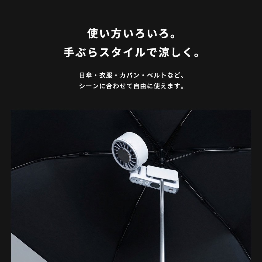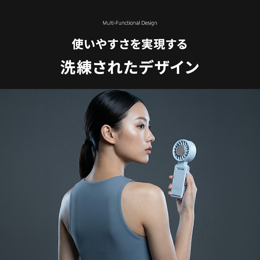 | 【多彩な機能を搭載】 冷却+ハンディ+クリップ+スタンド+首掛け。多機能な5WAYファン。 【横360度、縦180度ダブル回転設計】 上下180°・左右360°のダブル回転で、狙った場所に風を届けます。あらゆるシーンで、用途で。好きな角度で涼しい。 ※本製品は自動首振りではありません。 【体感温度を下げる、風+冷却プレート】 TEC冷却×パワー送風で、熱い風を送るだけになりがちなハンディファンの弱点を克服。 ※冷却機能は、送風時にのみ使用可能です。冷却機能単体での使用はできません。 ※充電中は冷却機能を使用できません。 【取付自由クリップ。これ1台で、どこでも】 日傘・衣服・カバン・ベルトなどに取り付けて。シーンに合わせて自由に使えます。グリップ部分にはシリコン製パーツを搭載。しっかりと固定し、傷をつけません。 ※傘などに取り付ける際は、クリップの凹みにしっかり固定してください。 ※クリップ部分の開き幅は約2.5cm程度です。 【屋外強風クラスのパワー最大7.7m/s】 小型なのにここまで涼しい。回転数7100rpmの力強さ。やさしいそよ風から、クールな暴風まで。レベル1から100までの繊細な調整が可能です。 ボタンの単押しor長押しで、2種類の風力調節が可能。ポチッと単押しで素早く5段階調整、じっくり長押しで段階にとらわれないシームレス調整を実現。 【便利なストラップ付属】 腕につけられ、長さ調整可能なストラップが付属。 ソフトで厚みがあり、快適な付け心地です。バッグにかける際にも便利。 ※ストラップをご使用の際は、付属のストラップ通しアシストパーツをご利用ください。 【最長4.8時間持続大容量3000mAhバッテリー】 次世代エネルギー統合バッテリー技術で長時間駆動。約3.8時間で充電完了、最長約4.8時間の連続使用を実現。 便利なUSB Type-Cケーブルでの充電に対応。 |