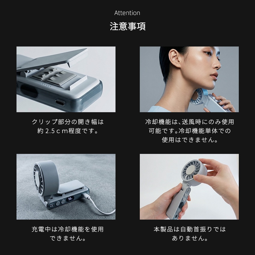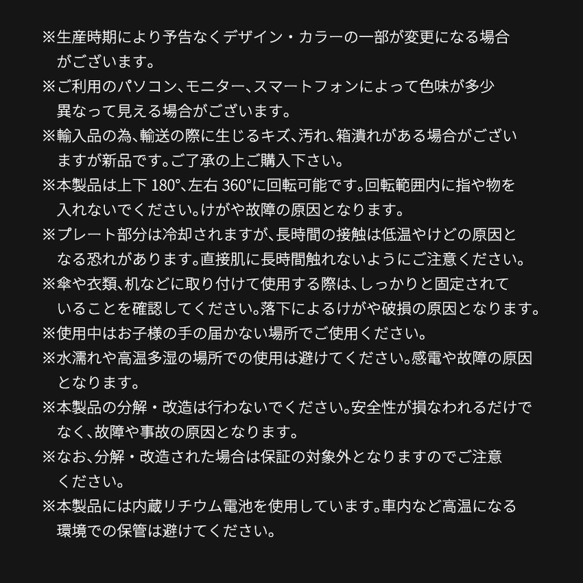 | ●生産時期により予告なくデザイン・カラーの一部が変更になる場合がございます。 ●ご利用のパソコン、モニター、スマートフォンによって色味が多少異なって見える場合がございます。 ●輸入品の為、輸送の際に生じるキズ、汚れ、箱潰れがある場合がございますが新品です。ご了承の上ご購入下さい。 ●ご購入後、初めて使用する前に2 時間ほど充電してください。 ●長期間使用しない場合でも、3 か月に1 回は充電してください(バッテリー保護のため)。 ●内蔵バッテリーのため、高温多湿の場所での長時間使用は避けてください。 ●本製品は上下180°、左右360°に回転可能です。回転範囲内に指や物を入れないでください。けがや故障の原因となります。 ●プレート部分は冷却されますが、長時間の接触は低温やけどの原因となる恐れがあります。直接肌に長時間触れないようにご注意ください。 ●傘や衣類、机などに取り付けて使用する際は、しっかりと固定されていることを確認してください。落下によるけがや破損の原因となります。 ●10歳未満のお子様が使用する際は、保護者の方が付き添ってください。 ●モーターの寿命を保つため、充電中の使用はお控えください。 ●本製品は防水仕様ではありません。水に濡らさないでください。 ●充電中は高温になる場合があります。可燃物の近くでの充電は避けてください。 ●異常を感じた場合は、ただちに使用を中止してください。 ●分解・改造は絶対にしないでください。 ●長時間使用しない場合は、満充電後に電源を切って保管してください。 ●廃棄の際は、各自治体の指示に従い、適切に分別・処理してください。 ●本製品は家庭用です。業務用途では使用しないでください。 |
