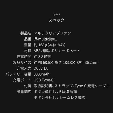 | 製品名:Lafuture マルチクリップファン 品番:lff-multiclip01 重量:約168 g(本体のみ) 充電時間:約3.8 時間 製品サイズ:約 幅68.6×高さ183.8×奥行36.2mm 充電入力:DC5V 1A バッテリー容量:3000mAh 充電ポート:USB Type-C 風量調節:ボタン単押し/ 5 段階調節、ボタン長押し/ シームレス調節 材質:ABS樹脂、ポリカーボネート 色:サンドベージュ・ミントブリーズ・フロストグレー 商品内容:本体・取扱説明書、ストラップ、Type-C 充電ケーブル |