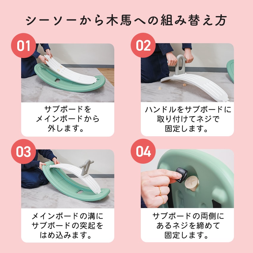 | ※本製品は必ず保護者の目の届く場所でご使用ください。 ※ご使用前には 毎回ネジやパーツのゆるみ・外れがないかを必ずご確認ください。 ※ゆるみがある場合は しっかり締め直してからご使用ください。 ※梱包材(ビニール袋など)はすぐに処分してください。お子さまが誤って口に入れると危険です。 ※本製品は必ず大人が組み立ててください。 お子さまの近くでの作業は避けてください。 ※3歳以上のお子さま向けの商品です。 対象年齢未満のお子さまには使用させないでください。 ※木馬モードの耐荷重は30kg シーソーモードは75kgです。 体重制限を超えて使用しないでください。 ※平らで安定した場所でご使用ください。 傾斜や段差のある場所では使用しないでください。 ※火気や高温になる場所では使用しないでください。 ※本来の使用目的以外でのご使用や お客様ご自身による改造・分解等は行わないでください。 これらに起因する故障・自己につきましては 当社での一切の責任を負いかねます。 |