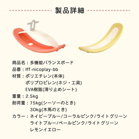 | 製品名:多機能バランスボード 品番:lff-nicoplay-bb サイズ:850×300×410mm(木馬モード) 850×300×200mm(シーソーモード) 重量:約2.5kg 材質:ポリエチレン、ポリプロピレン、EVA樹脂 色:ネイビーブルー・コーラルピンク・ライトグリーン・ライトブルー・ペールピンク・ディープグリーン・レモンイエロー セット内容:メインボード/サブボード/ハンドル/滑り止めシート/中ナット/小ナット/締め付けネジ |