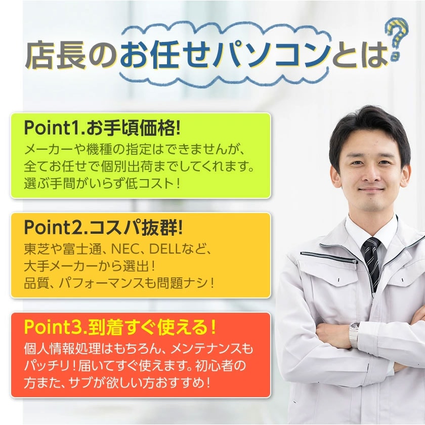 | メーカー | メーカーはお選び頂けません。 (例FUJITSU、NEC、TOSHIBA、DELL、HPなどブランドメーカー) |