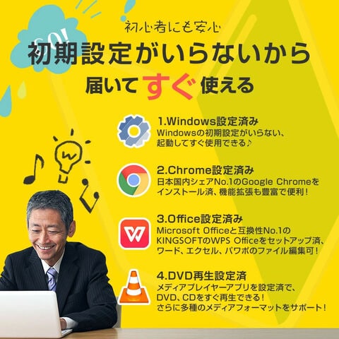 ・操作OS、 Officeソフト、 Google ChromeとDVD Playerセットアップ済み、初心者にもオススメ、届いてから、すぐ使えます♪