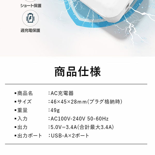 ACアダプター USB-ACアダプタ 急速充電器 2ポート 5V 3.4A USB スマートIC 充電器 チャージャー PSE認証 USB充電器 AC充電器 コンセント アンドロイド スマホ アイフォン iPhone Android TOKAIZ