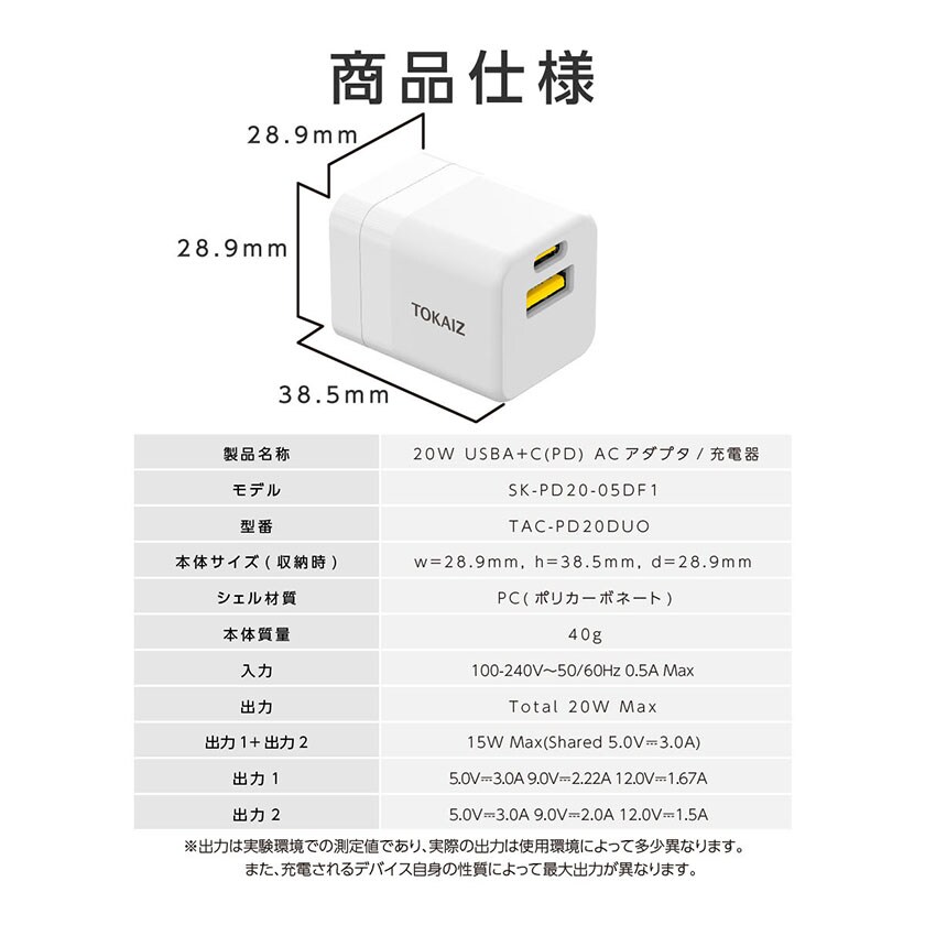 モデル:SK-PD20-05DF1 本体サイズ(収納時):W28.9mm×H38.5mm×D28.9mm シェル材質:PC(ポリカーボネート) 本体質量:40g 入力:100-240V~50/60Hz 0.5AMax 出力:Total 20W Max 出力1+出力2:15W Max(Shared 5.0V 3.0A) 出力1:5.0V 3.0A、9.0V 2.22A、12.0V 1.67A 出力2:5.0V 3.0A、9.0V 2.0A、12.0V 1.5A |