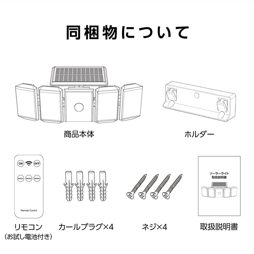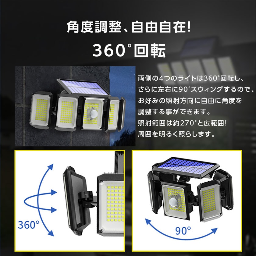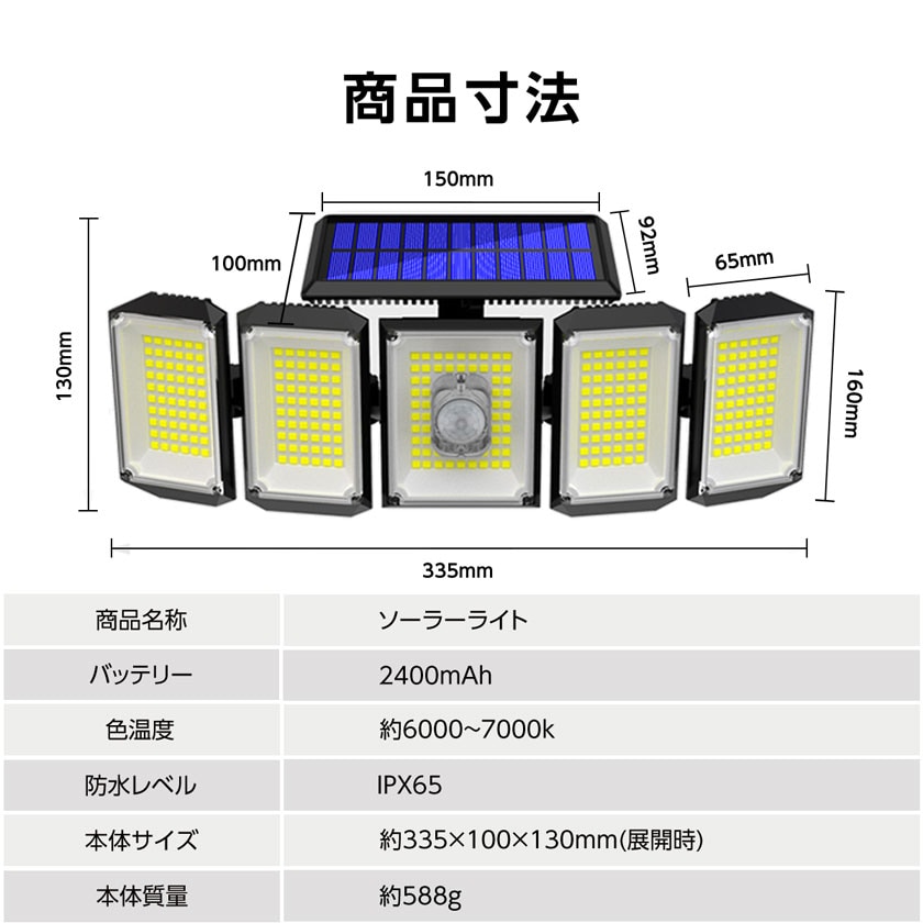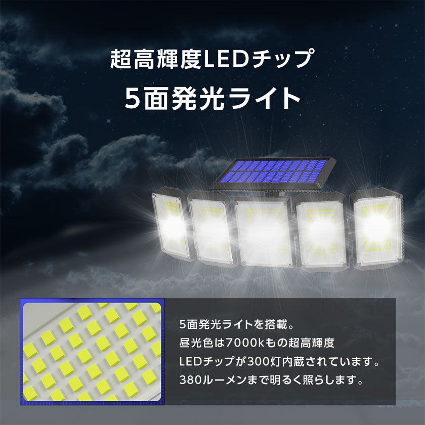 ・【5面発光ライト】5面発光ライトを搭載。昼光色は7000kもの超高輝度LEDチップが300灯内蔵されています。380ルーメンまで明るく照らします。・【ソーラー充電式】低温環境でも利用できるソーラー充電式電池を内蔵。曇りや雨の日でも日中に充電でき、冬でも安心してお使いいただけます。