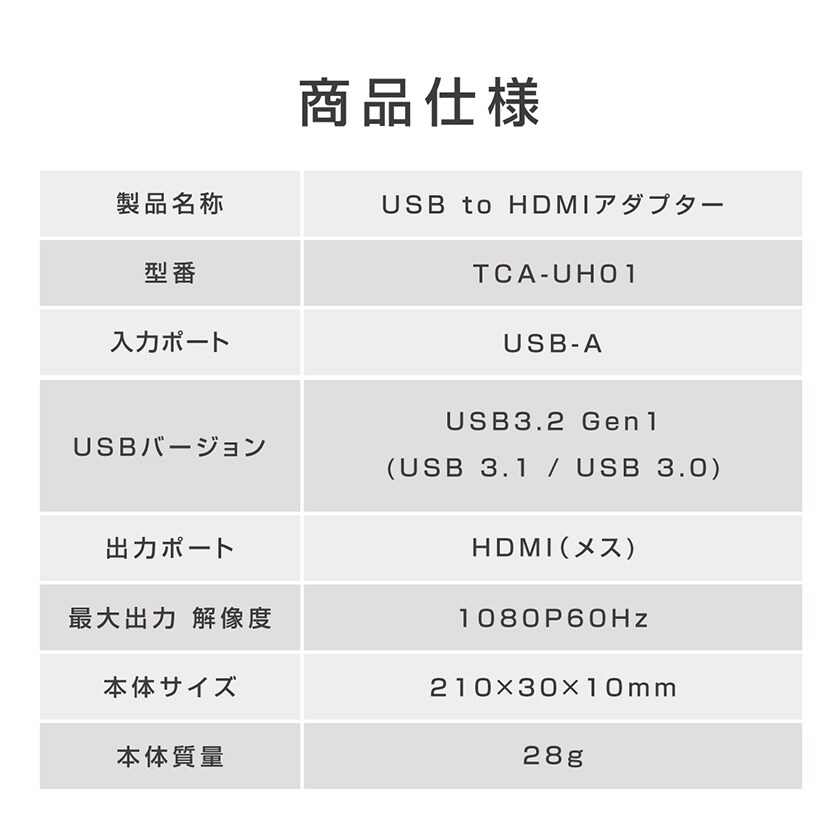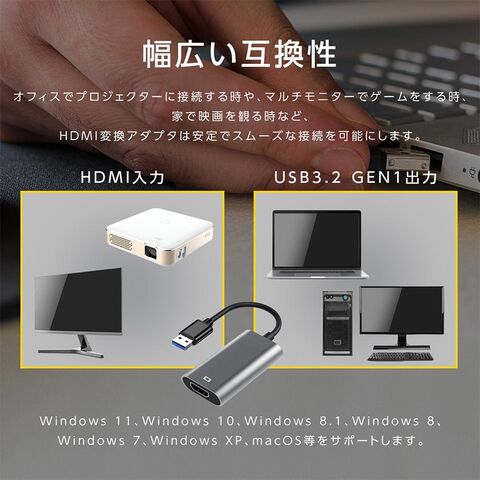 入力ポート:USB-A USBバージョン:USB3.2 Gen1(USB3.1/USB3.0) 出力ポート:HDMI(メス) 最大出力 解像度:1080P/60Hz 本体サイズ:210×30×10mm 本体質量:28g 対応OS:Windows11/10/8.1/8/7/XP、macOS等 |