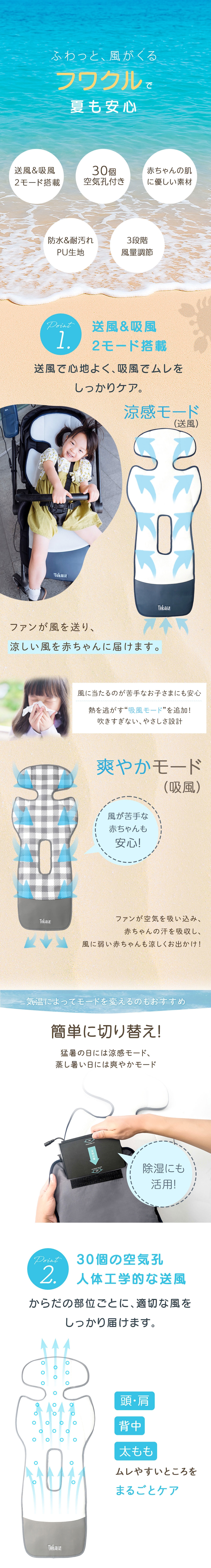 ・【30個の空気孔付き】30個の空気孔から風を送り、赤ちゃんの全身に涼しい風を届けることができます。汗をかいてしまう赤ちゃんも快適に過ごせます。
