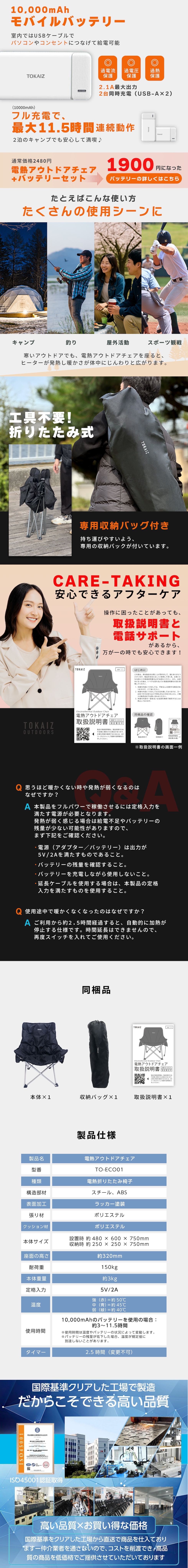 種類:電熱折りたたみ椅子 構造部材:スチール、ABS 表面加工:ラッカー塗装 張り材:ポリエステル クッション材:ポリエステル 本体サイズ:設置時約480×600×750mm、収納時250×250×750mm 座面の高さ:約220mm 耐荷重:150kg 本体質量:約3kg 定格入力:5V/2A 温度:強(赤)-約50度、中(青)約45度、弱(緑)約40度 使用時間:10,000mAhのバッテリーを使用する場合約3~11.5時間 タイマー:2.5時間(変更不可) |
