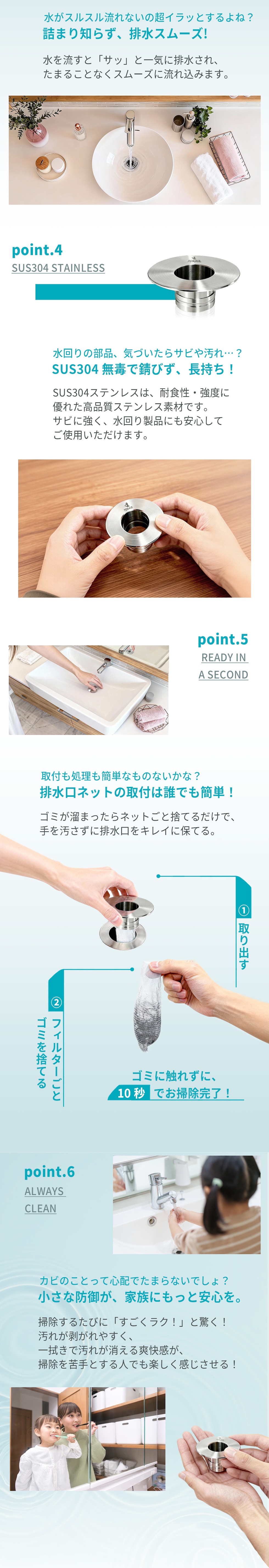 ・【排水溝5つの悩みが劇的に解消出来ます】髪の毛詰まり・水アカ・悪臭・虫沸き・掃除・これ一つで全部解決!・【304ステンレスを採用】他のステンレスに比べサビに強く、耐腐食・耐熱力がある素材を厳選しました。