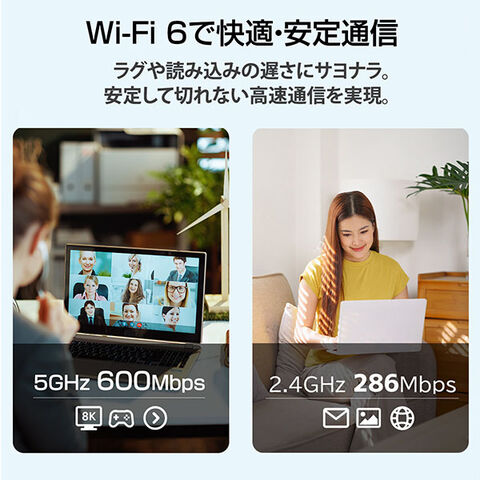・【AX対応・Wi-Fi6搭載】次世代通信規格「Wi-Fi6(AX)」対応。5GHzで最大600Mbps、2.4GHzで最大286Mbpsの高速通信を実現。・【MU-MIMO + OFDMA対応】複数端末との同時通信でもスムーズ。通信のムダを省き、ネットワーク全体の効率を大幅アップ!