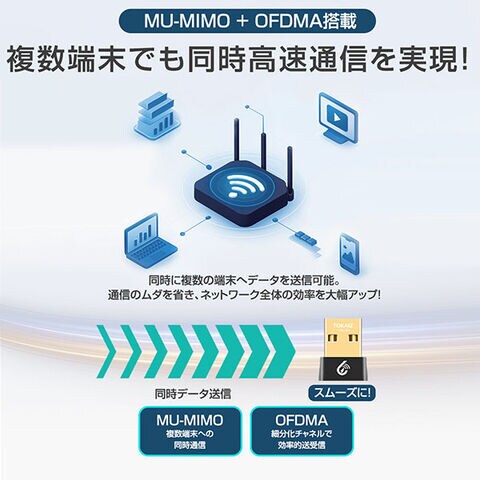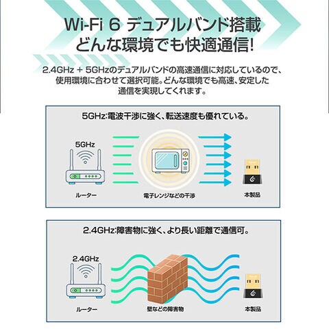 | 商品特徴 | ◎超小型高速600Mbps + 286Mbps ◎2.4GHz+5GHz対応 ◎Wi-Fi6 AX対応 ◎コンパクトサイズ ◎無線設備適合認証済み |