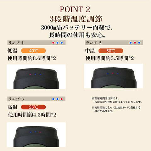 型番:TCE-EHW02 定格入力:5V/1A(Type-C) 製品質量:52.5g×2 バッテリー:2000mAh×2 サイズ:78×42×15mm 製品材質:ABS+アルミ合金 温度設定:40℃ / 50℃ / 55℃ 連続使用時間(5℃環境):高温 約2.6時間 / 中温 約3.4時間 / 低温 約3.8時間 |