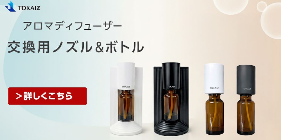 製品名:アロマディフューザー ブランド:TOKAIZ 型番:TAD-005 本体サイズ:70mm×70mm×135mm 本体質量:約300g タイマー選択:1時間/2時間/3時間/4時間 噴霧出力選択:弱-3分間に15秒噴霧/中-3分間に60秒噴霧/強-3分間に90秒噴霧 対応オイル種類:発揮性エッセンシャルオイル/アロマディフューザー対応アロマオイル 充電ポート:USB-C 定格入力:DC5V/1A バッテリー容量:2,000mAh 付属品:商品本体×1/USB-A to USB-C充電用ケーブル×1/取扱説明書、保証書×1 |