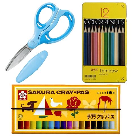 はさみ(ブルー・右手用)・クレパス(16色)・色鉛筆(12色)の3点セットです。