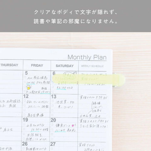 パタパタめくれるクリップ型しおりページをめくっても、しおり部分が自動で追従して開いたページをしっかりキープするので、読みかけのページを見失いません。クリアなボディで文字が隠れず、読書や筆記の邪魔になりません。クリップ型で、表紙に挟んで仕様するので、なくす心配もありません。■開いたページへ移動するしおりページをめくるたびにシリコン製のしおり部分が開いているページにパタパタと移動するので、読書中に読みかけのページを見失うという、ちょっとした煩わしさを感じずに済みます。本の裏表紙となる部分にクリップを挟んで使用するので、読書中にしおりをなくす心配もありません。■クリアなボディで文字が隠れないしおり部分はクリアなシリコン素材を使用しており、図や文章の上にかぶせても視界の邪魔にならず、必要な情報を隠さずにページをしっかり押さえられるのが魅力です。 また、クリップ部分はペンホルダーとしてもご使用いただけます。本体サイズ ヨコ90×タテ18×14mm材質 クリップカバー・シリコーン/クリップ・スチール