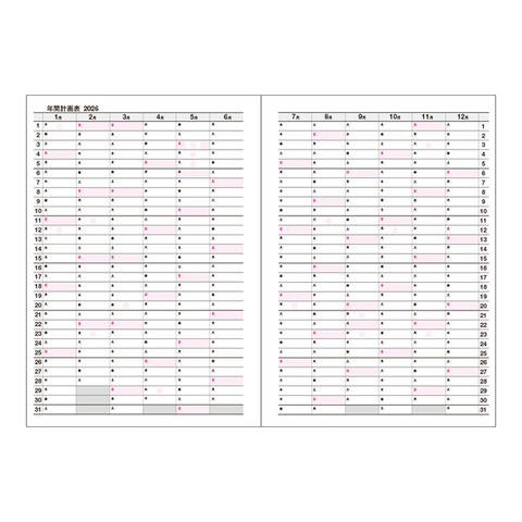 背がしなやかでとじ目まで開きやすい糸かがりとじ製本のブロックタイプ見開き1ヶ月ダイアリーです。仕様:塩ビ製差込表紙、糸かがりとじ 内容:年間計画表、プランニングテーブル、LIFE PLAN、月間ダイアリー、統計、ノート、アドレス、資料編