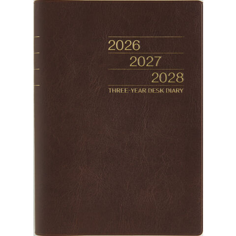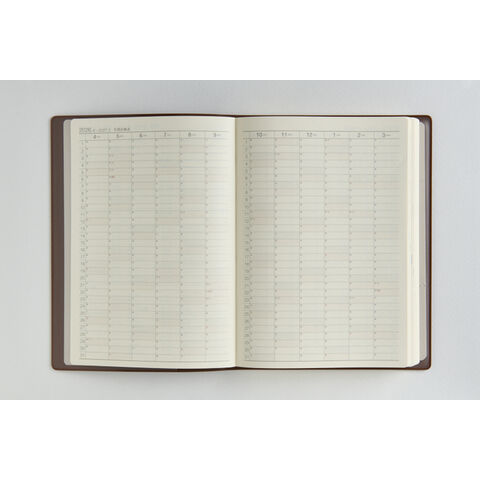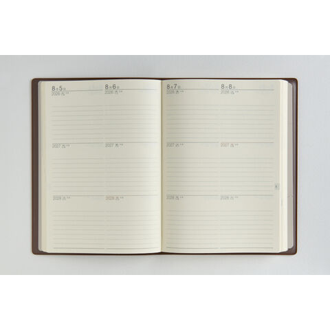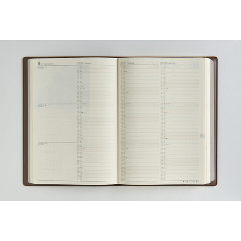 3年分の記録を書き込める連用ダイアリー。横罫式の月間ページは3年分の予定が一覧でき、ビジネスや年間行事などの管理に役立つ一冊です。長年使い続けられるよう、耐久性にも優れた商品です。シックなブラウンのカバーで、ビジネスにもプライベートにも馴染む1冊です。