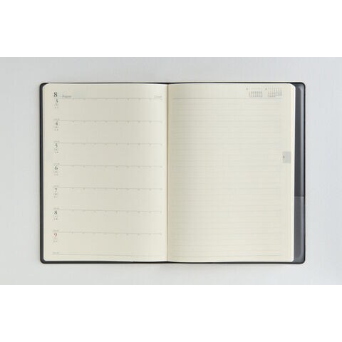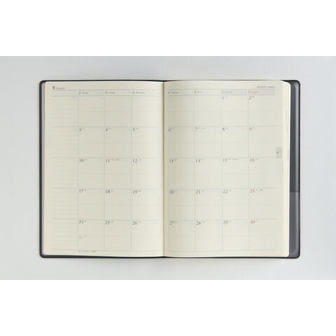 ビジネスシーンにも馴染むベーシックなカバーデザイン。記入形式は定番の月間ブロック式・週間レフト式のレイアウトです。巻末メモも30P以上あり、たくさんメモができるのも魅力の一つ。