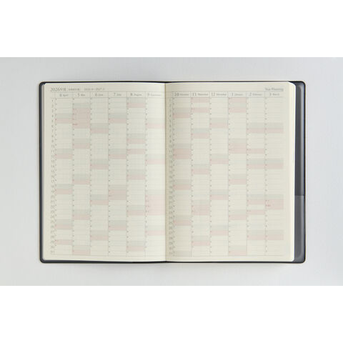 【月間予定表】カレンダーと同じ感覚で見ることができ、週ごとの予定が把握しやすいブロック式。1日の記入スペースが上下段に分かれているので、午前・午後など予定を書き分けるのに便利。左端には罫線が入っていて、週ごとのメモもできます。 【週間予定表】左にスケジュール、右に横罫メモが付いているレフト式。スケジュール欄は8~24時までの時間目盛りが付いているので、時間ごとのメモに便利。当月・翌月のミニカレンダーもついていて、先の予定も確認できます。