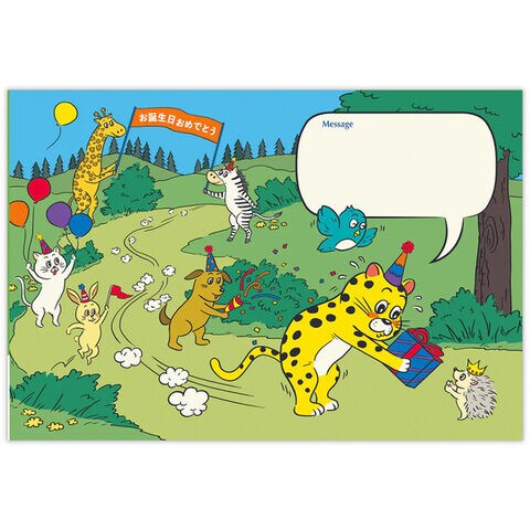 【送料無料】誕生お祝い オルゴールカード 動く・ダダダ誕生日 チーター 仕掛け付 封筒付 子供 メッセージ かわいい ミドリ - メール便発送