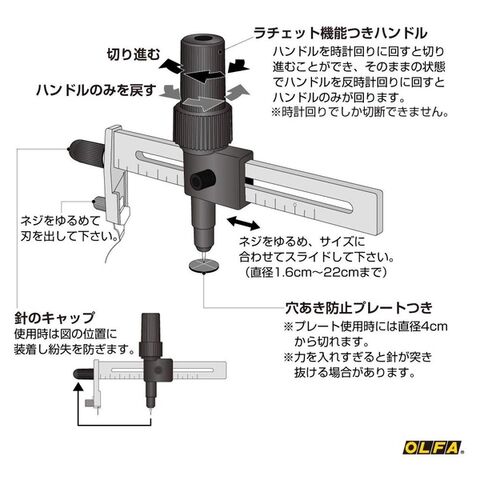 ハンドルにラチェット機構が付いているので、無理に手首をひねることなく、直径1.6~22cmまでの円を簡単にカットできます。紙、ビニール、フィルムなどに。穴あき防止プレート付き。プレート使用時は直径4cm~22cmまでカット可能。