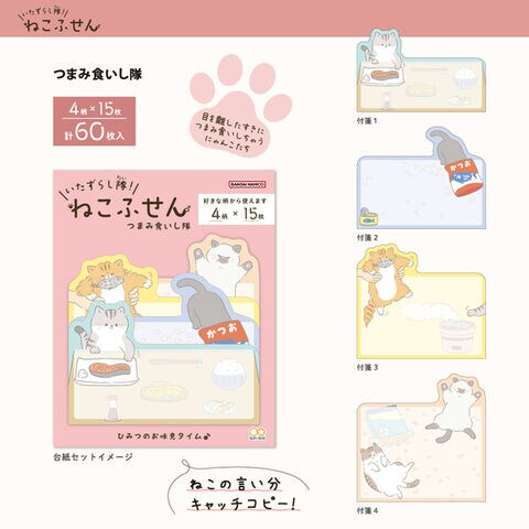 いたずらし隊!ねこふせん つまみ食いし隊 4柄×各15枚 猫 ネコ にゃんこ 付箋 ダイカット かわいい サンスター文具