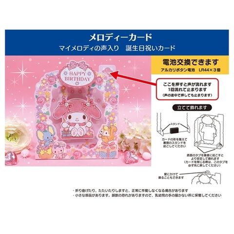 ボタンを押すと「HAPPY BIRTHDAY TO YOU」のメロディーをBGMに、マイメロディが楽しくお話し、大切なお誕生日をお祝いしてくれます。
