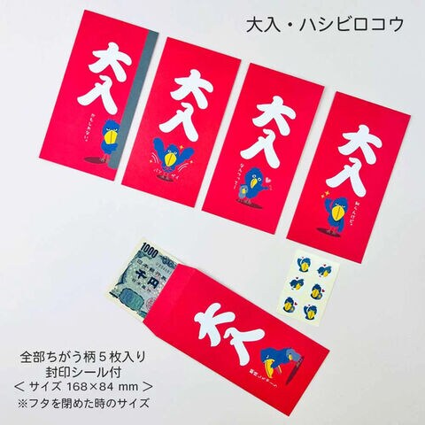 【1000円以上お買い上げで送料無料♪】おもしろ金封 大入 ハシビロコウ 5柄入 封印シール付 ポチ袋 ぽち袋 お年玉 鳥 トリ かわいい 日本製 パインブック - メール便発送