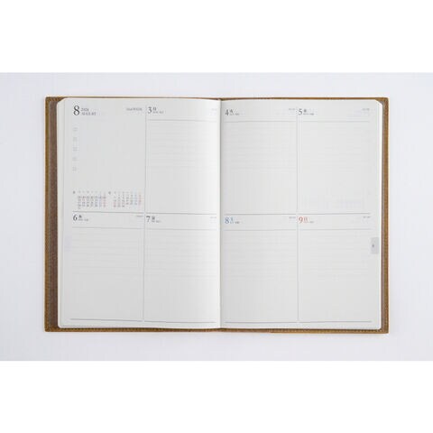 スタンダードな記入形式、上品なフォント、見やすく紙面になじむ刷色など、ストレスなくお使いいただけるのが人気の理由です。月間ページがまとまった月間集約型のページ構成は、月をまたぐ予定管理に便利。